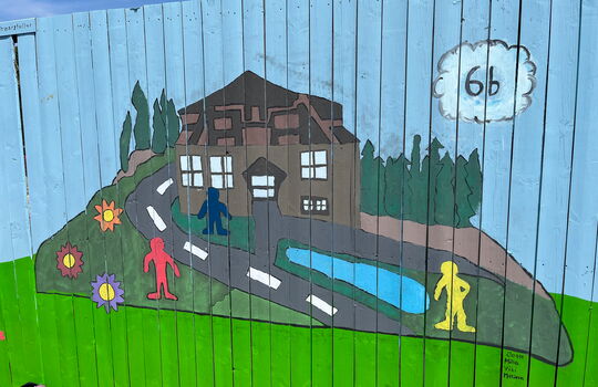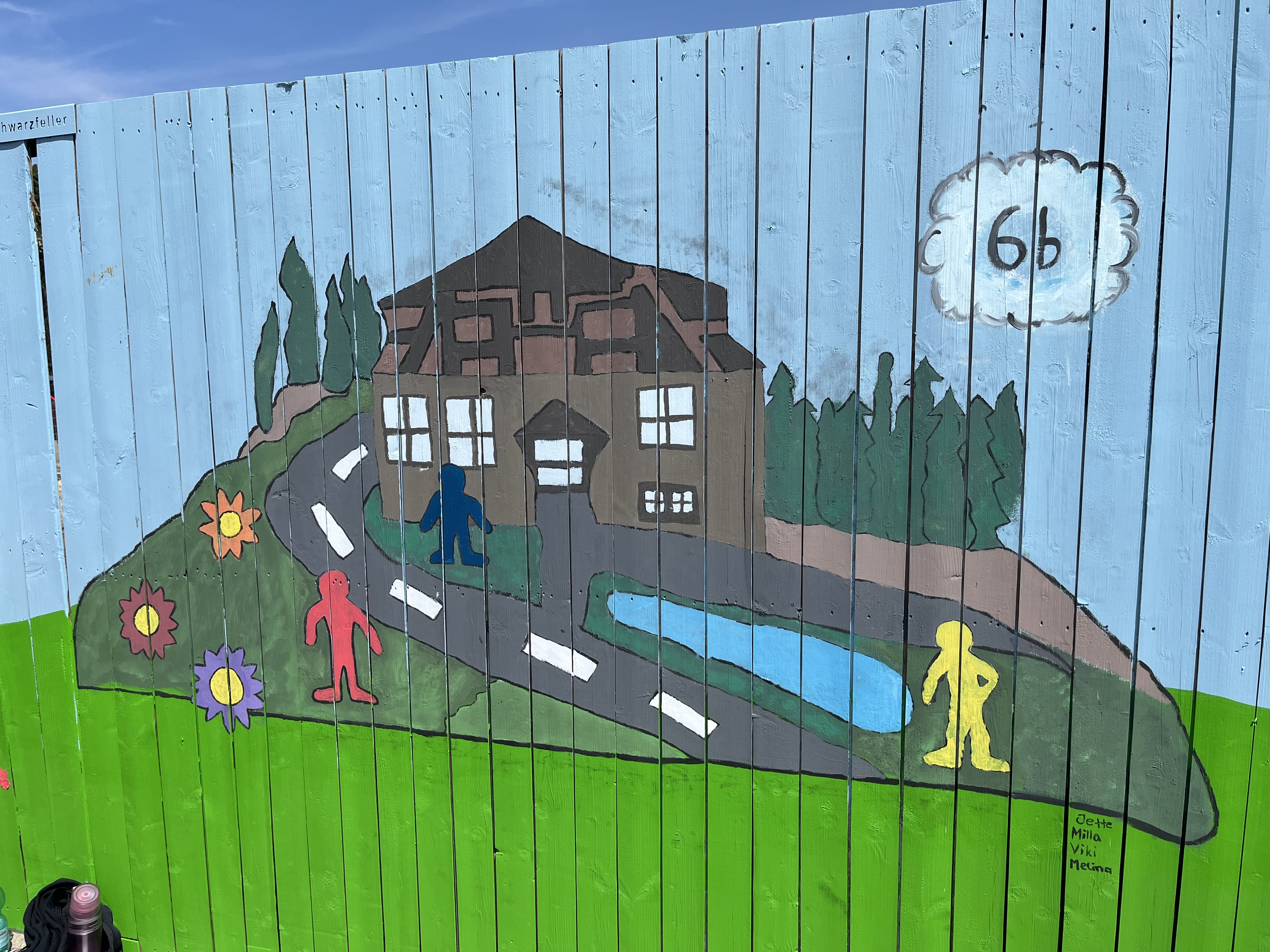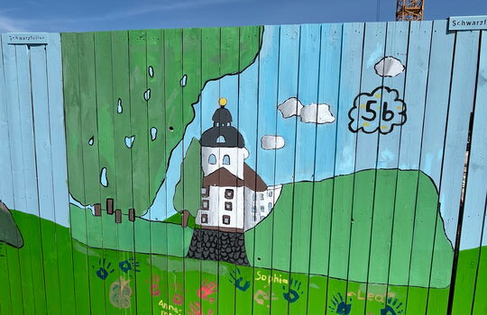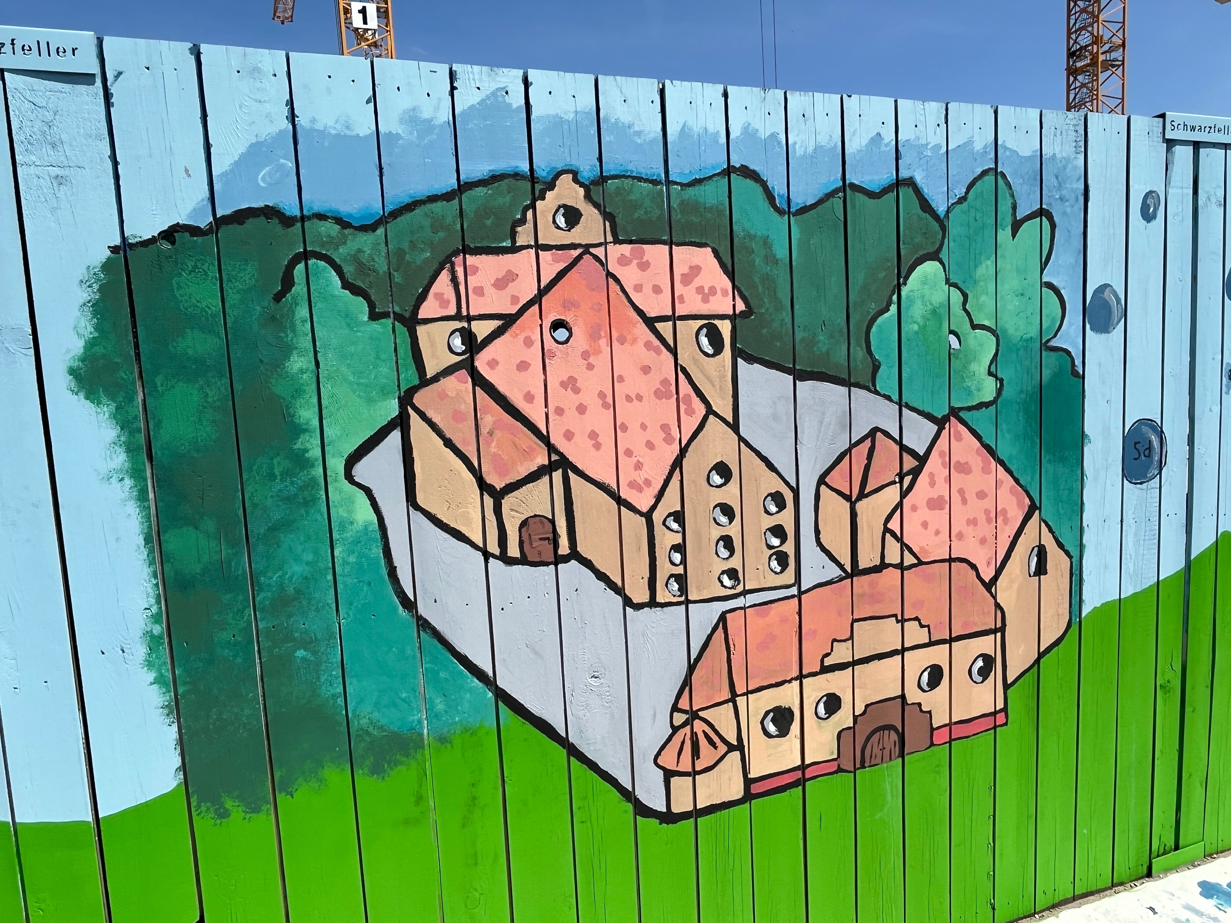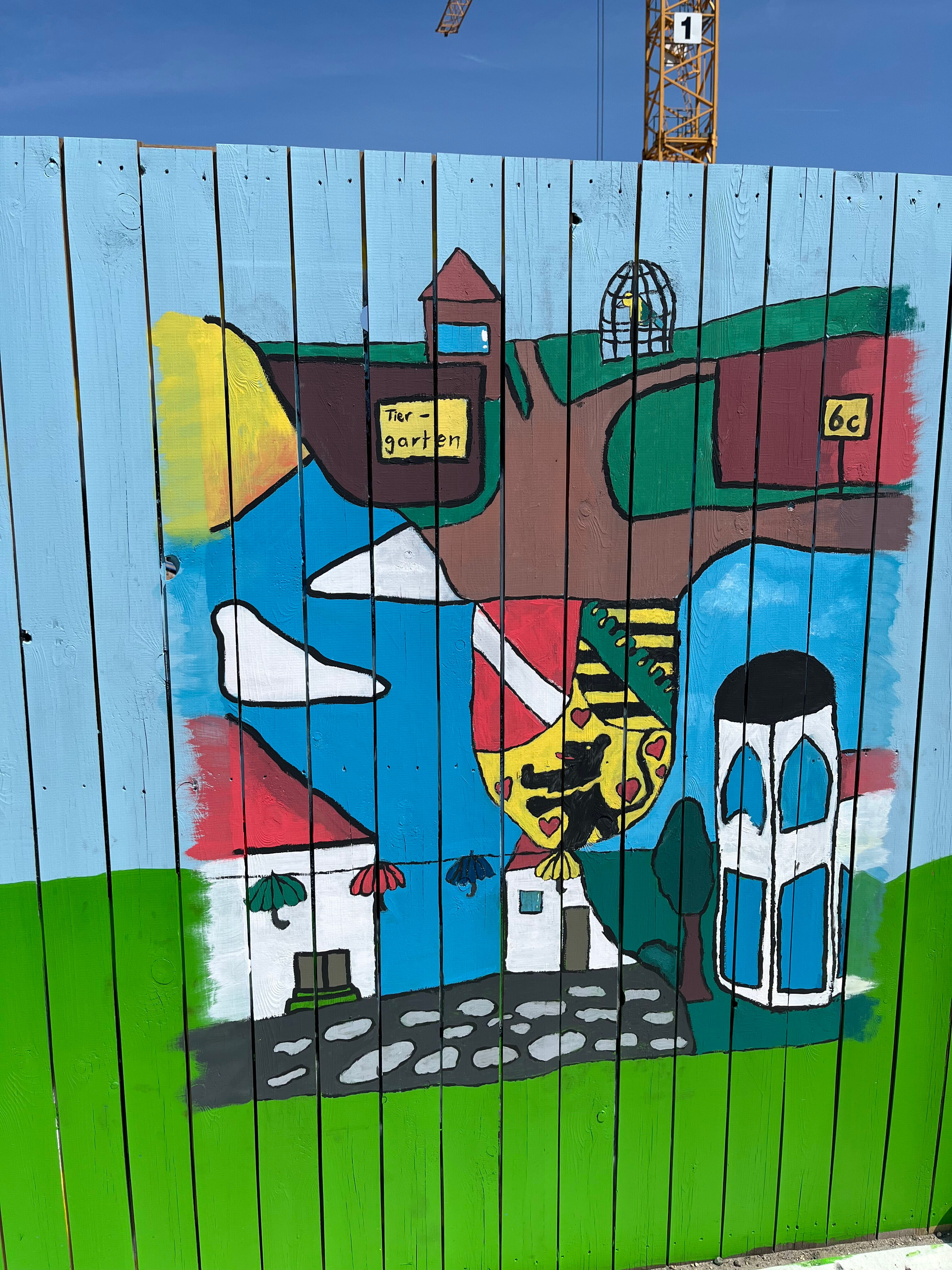 Im Kunstunterricht wurden Entwürfe gefertigt und die besten Ideen ausgewählt. Am 12. und 13. Juni wurden dann die Vorlagen auf einen Teil des Bauzauns übertragen und farbig ausgestaltet. Die Firma Züblin sponsorte die Farben und prämierte das Siegerbild der Klasse 6a mit 200€.