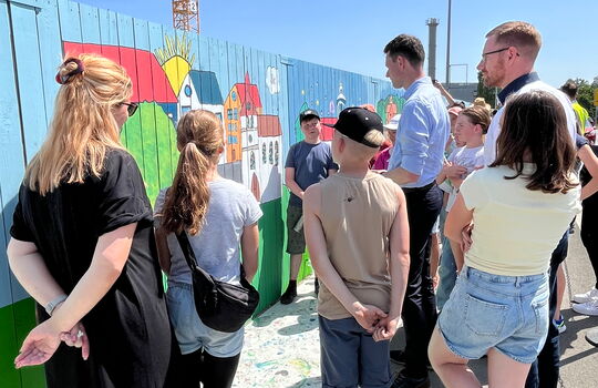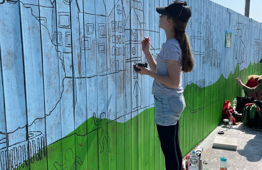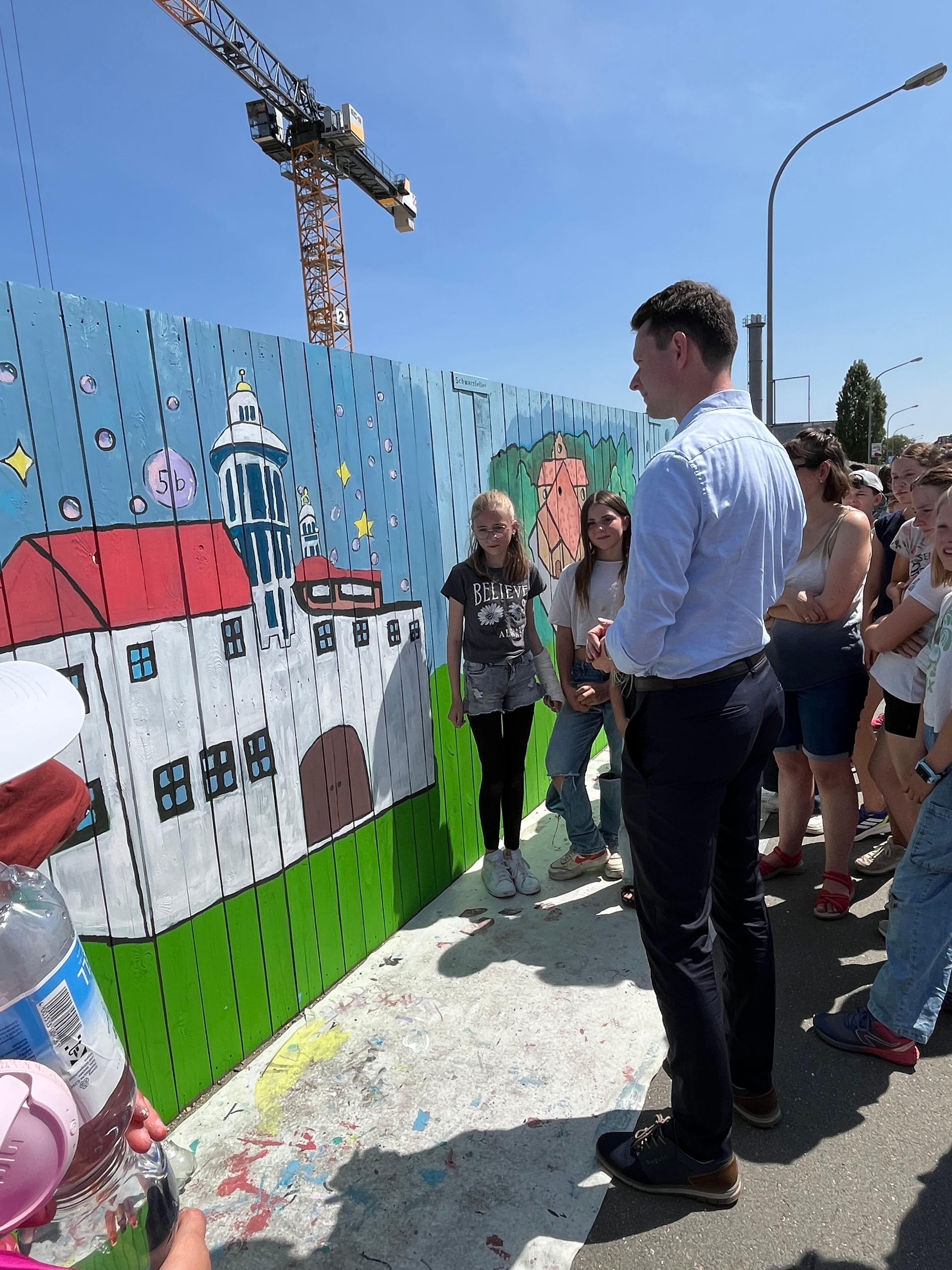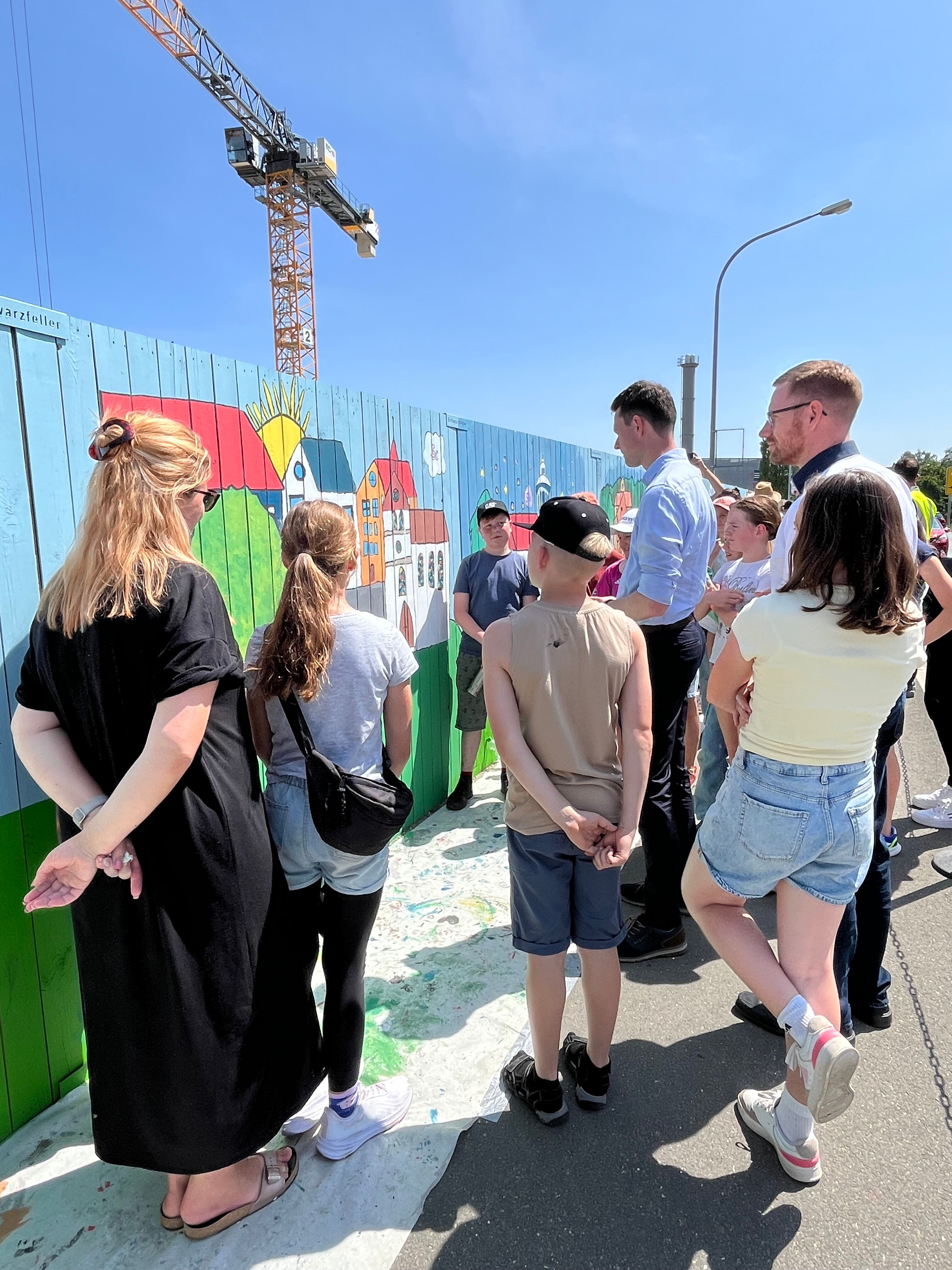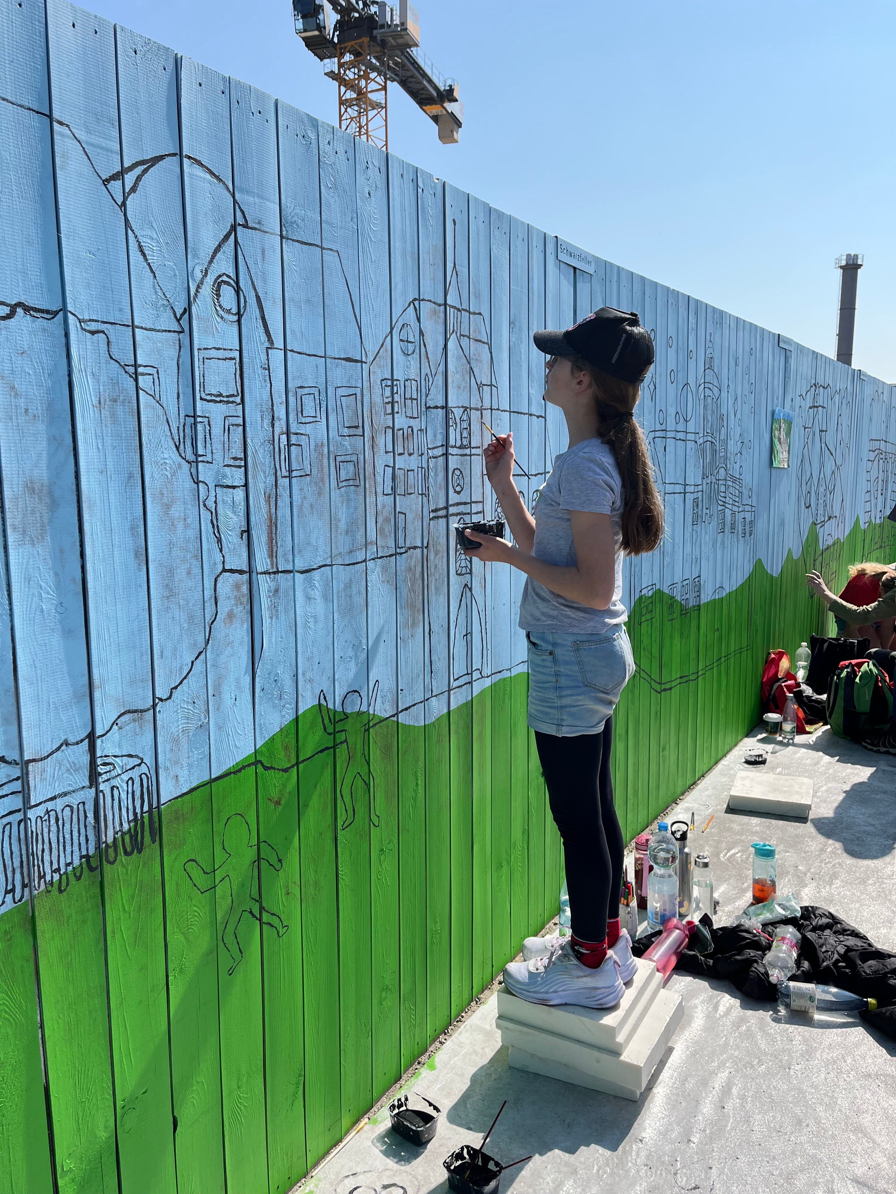 Im Kunstunterricht wurden Entwürfe gefertigt und die besten Ideen ausgewählt. Am 12. und 13. Juni wurden dann die Vorlagen auf einen Teil des Bauzauns übertragen und farbig ausgestaltet. Die Firma Züblin sponsorte die Farben und prämierte das Siegerbild der Klasse 6a mit 200€.